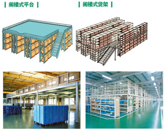 5、下層是貨架形式,上層可以是平臺(tái)也可以是貨架的結(jié)構(gòu)。底層貨架既可以存儲(chǔ)物料又是樓面的支撐,極具靈活性
