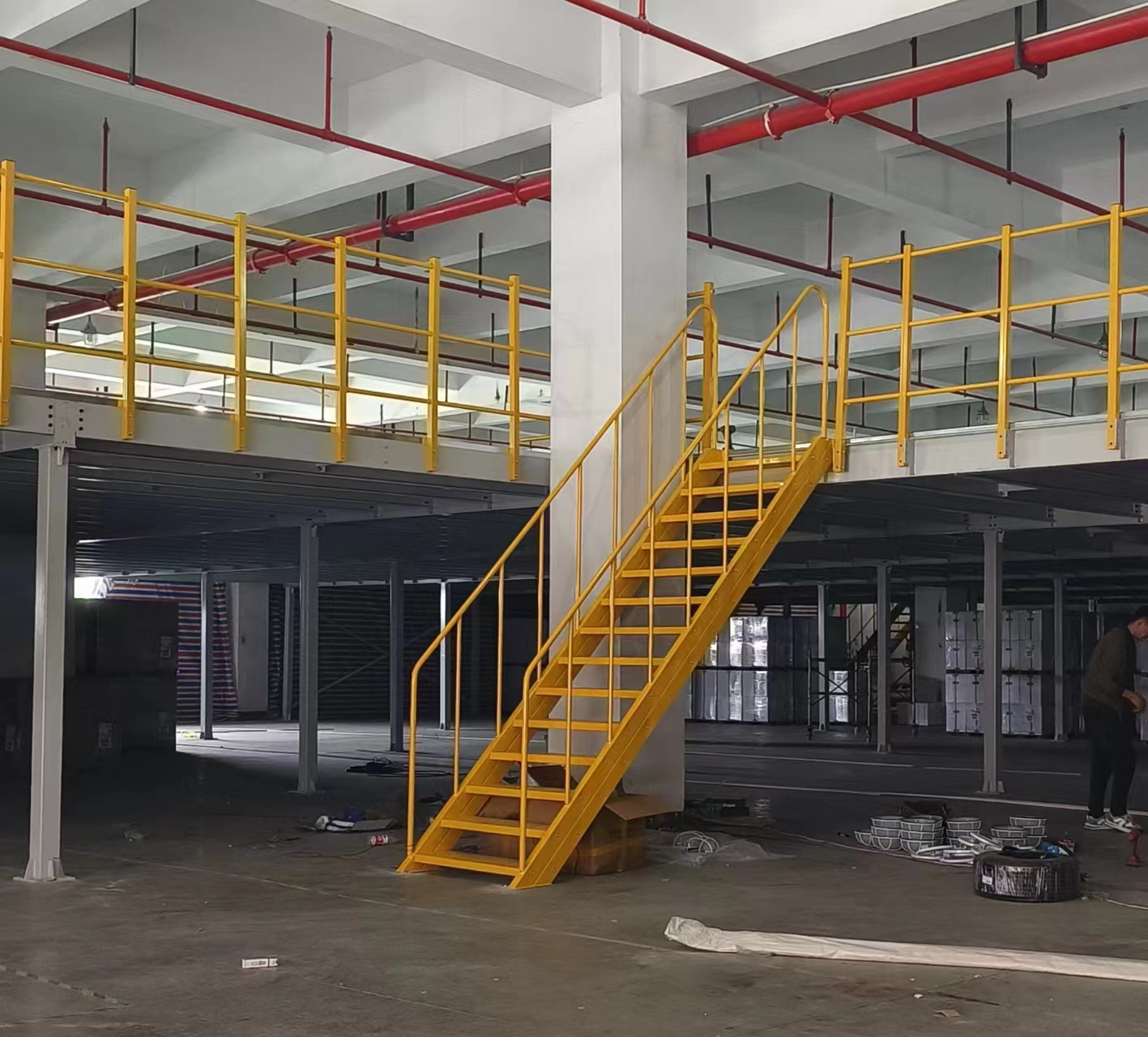 用叉車、升降臺(tái)或傳送帶將貨物運(yùn)送到鋼平臺(tái)貨架的二層或三層,然后用手動(dòng)或液壓卡車運(yùn)送到指定位置